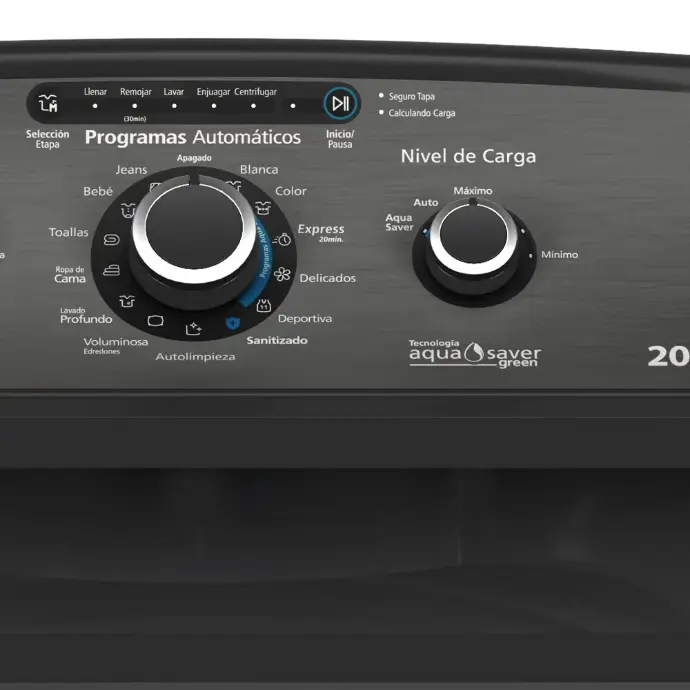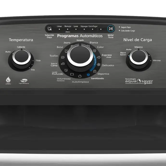 Lavadora MABE LMC70203WDAB0: Eficiencia y durabilidad Ahorra hasta un 76% de agua y 55% de energía con la tecnología Aqua Saver Green de esta lavadora. Fabricada con tina de acero inoxidable y acabados metálicos, incluye tapa amortiguada con seguro y un panel intuitivo con 3 perillas, 13 ciclos automáticos y 5 niveles de carga (más automático). Ideal para un lavado personalizado y sostenible, combina rendimiento robusto con cuidado al medio ambiente. ¡Adquiérela hoy y lava con inteligencia!