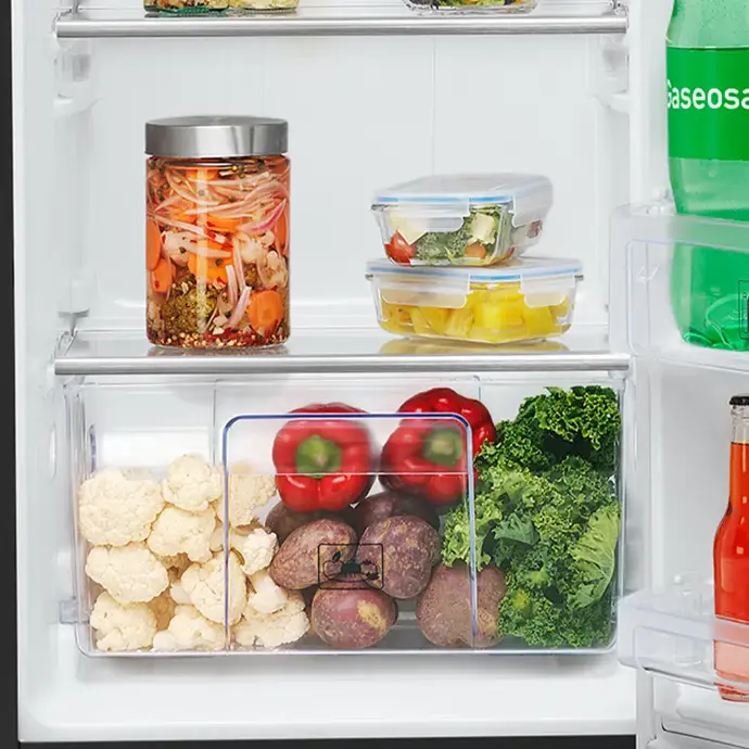 Facilita la conservación y visualización del estado de los alimentos, cuenta con topes de seguridad que evitan que se retire por completo el cajón.