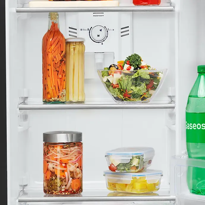 Mejor distribución de bandejas y anaqueles para almacenar todo tipo de alimentos y recipientes de cualquier tamaño incluso bebidas de 3 litros.
