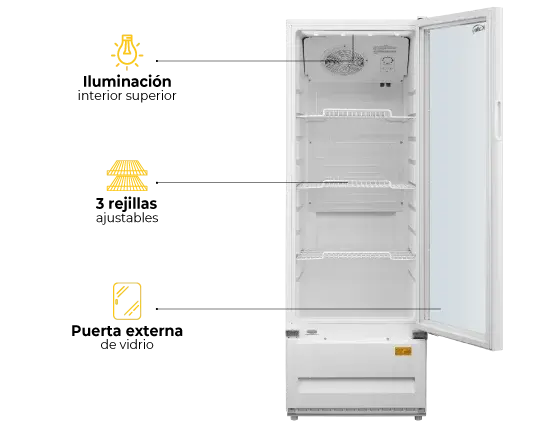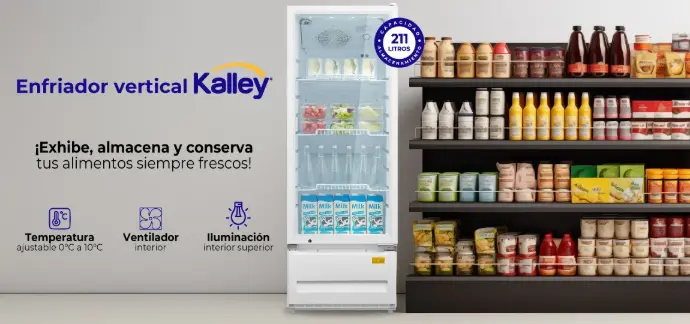 Diseñada para maximizar la visibilidad de tus productos, el enfriador o vitrina refrigerada Kalley cuenta con iluminación interior superior tipo LED, puerta de vidrio que permite una exhibición elegante y 3 rejllas ajustables para organizar a tu manera.