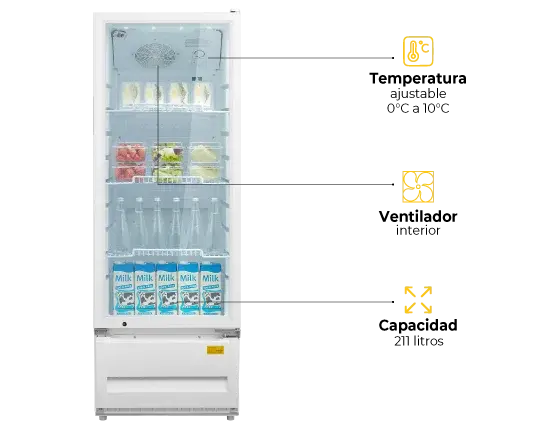 Almacena y exhibe tus alimentos y bebidas con la vitrina Kalley de 211 litros, equipada con tecnología ecoamigable que utiliza gas refrigerante R600a para un rendimiento responsable con el medio ambiente. Su iluminación LED ofrece una visualización clara y nítida, mientras el sistema de ventilación interior mantiene la frescura y calidad de tus productos por más tiempo. ¡Practicidad, eficiencia y cuidado ambiental en un diseño funcional!