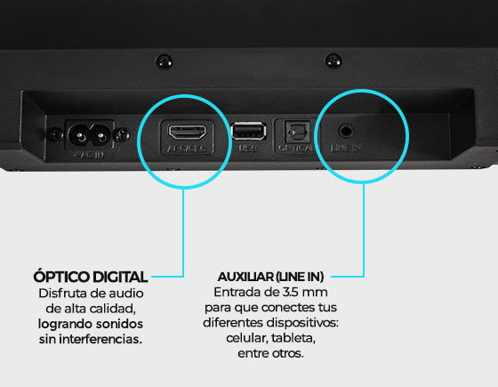 Entrada óptica con audio de alta calidad y sonidos más fieles. Entrada HDMI, audio y video en alta definición.