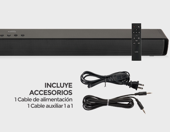 Esta barra de sonido trae control remoto, cable auxiliar y soporte.