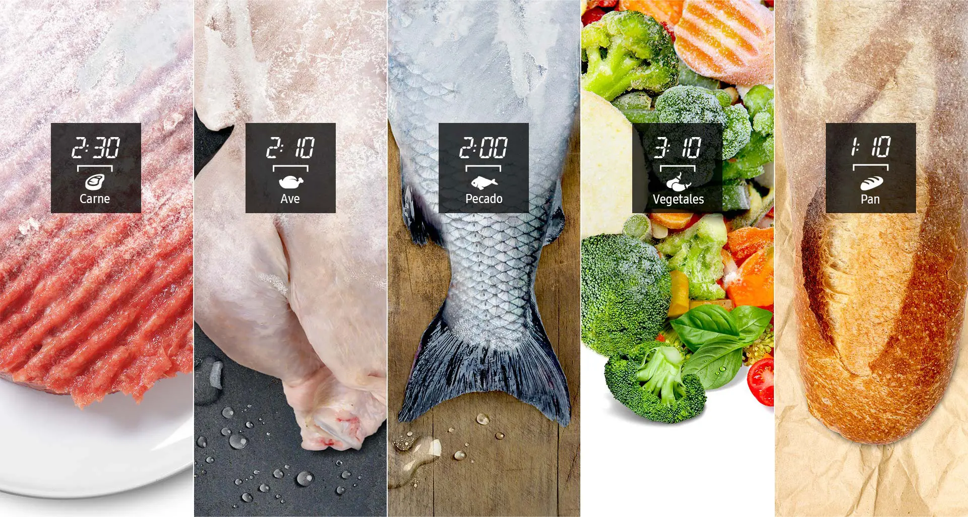 La función Descongelado Rápido, descongela los alimentos de manera rápida y uniforme. Su algoritmo, calcula el tiempo de descongelamiento correcto para cinco tipos de alimentos comunes, disminuyendo el tiempo de preparación de los ingredientes.